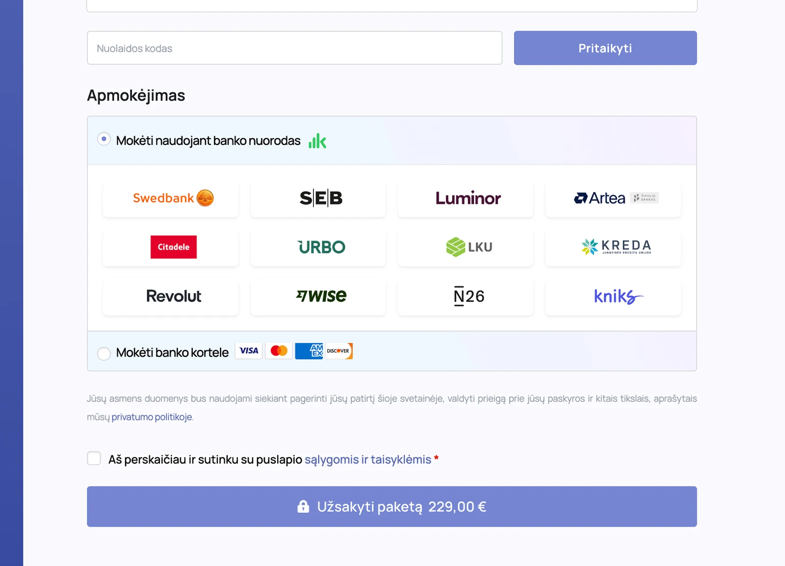 Apmokėjimas atliekamas saugiai internetu, naudojant pasirinktą mokėjimo būdą - MakeCommerce arba Stripe.
